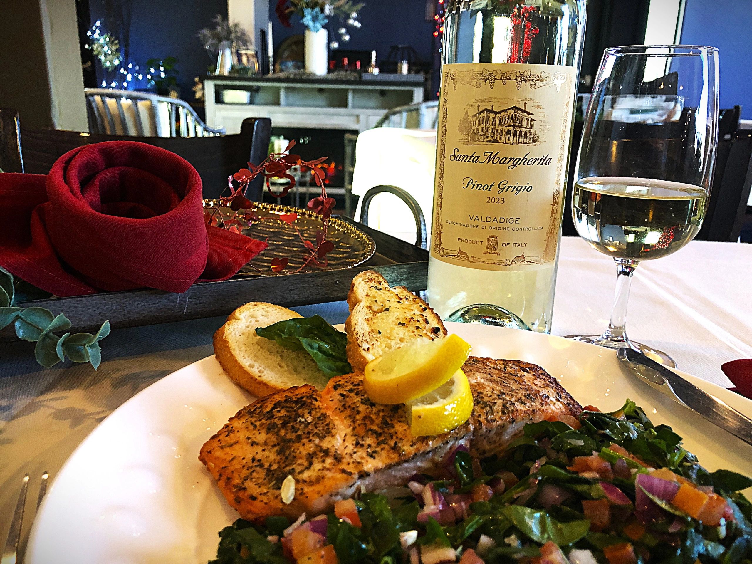 Our own spiced Italian-herbed salmon is pan-seared and oven roasted to create flavor and perfection. Served with Fresh: Baby spinach, basil, diced tomatoes, finely chopped red onions, red wine vinaigrette. Paired with Garlic cheese crostini.