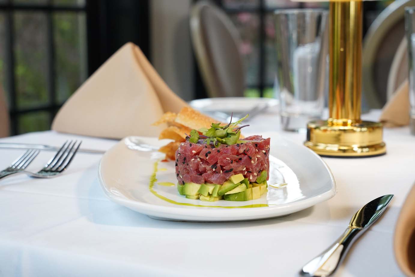 Yellowfin tuna, sesame-soy vinaigrette, crackers, avocado, sriracha.