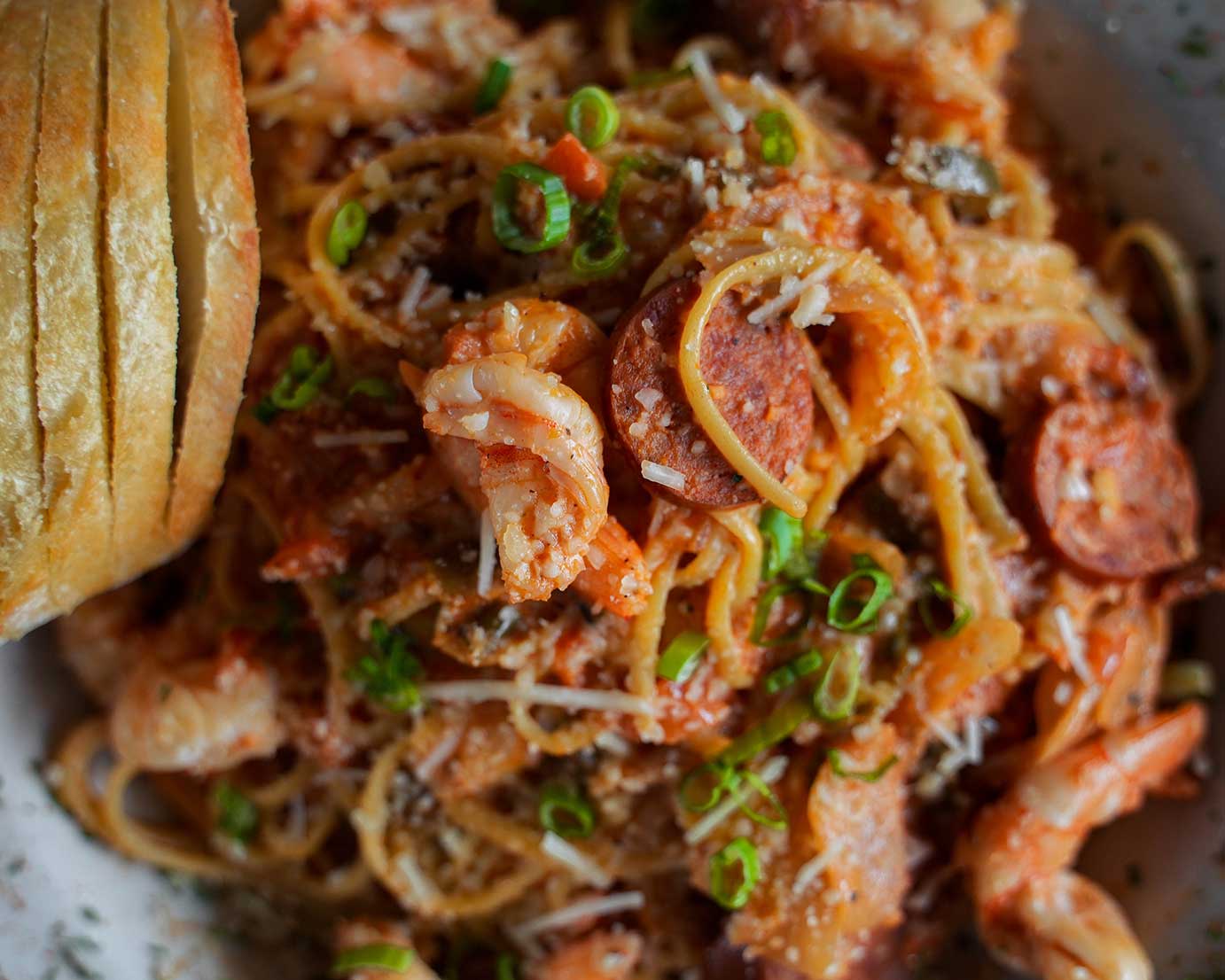Pan seared gulf shrimp, andouille sausage, sautΓ©ed peppers, onions and tomatoes in a parmesan creole cream sauce over fettuccine