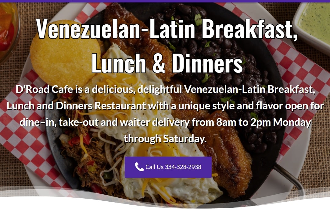 Macros Menu. "D'Road Cafe welcomes you to our Latin Home cooking style Menu - Nutrition Facts β Macros & Calories." https://macros.menu/d-road-cafe-montgomery-al. Accessed December 26, 2025.
