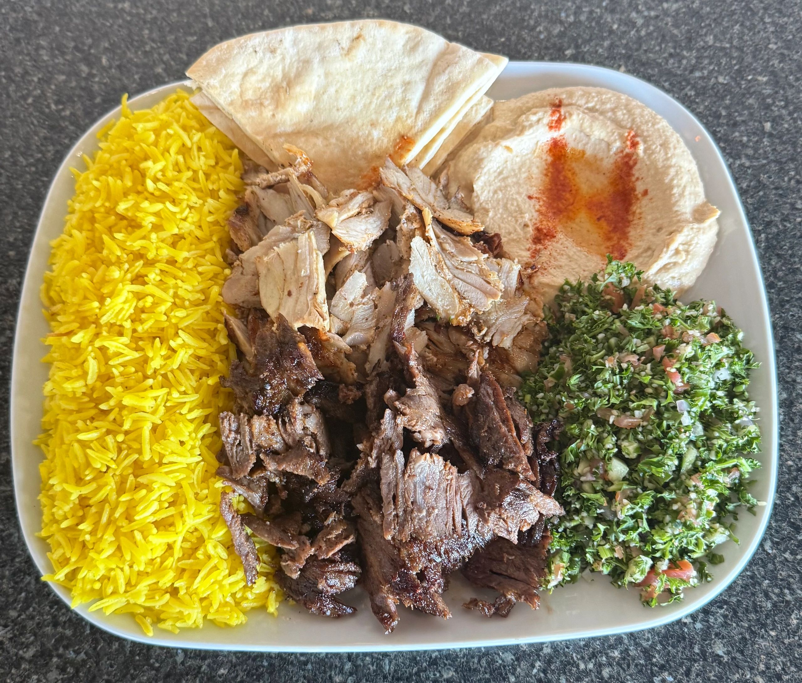 2 beef kabob / 2 chicken kabob / 1 beef chunk / 1 chicken chunk/ side beef & chicken shawaema & 6 pita
