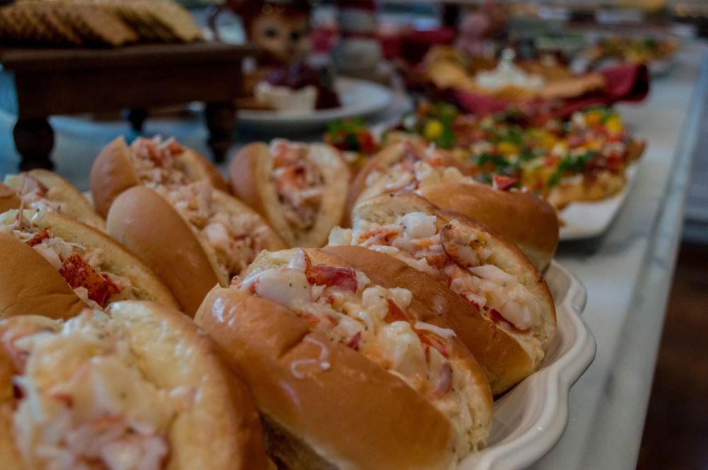Top split butter toasted roll filled with La La Lobster deliciousness