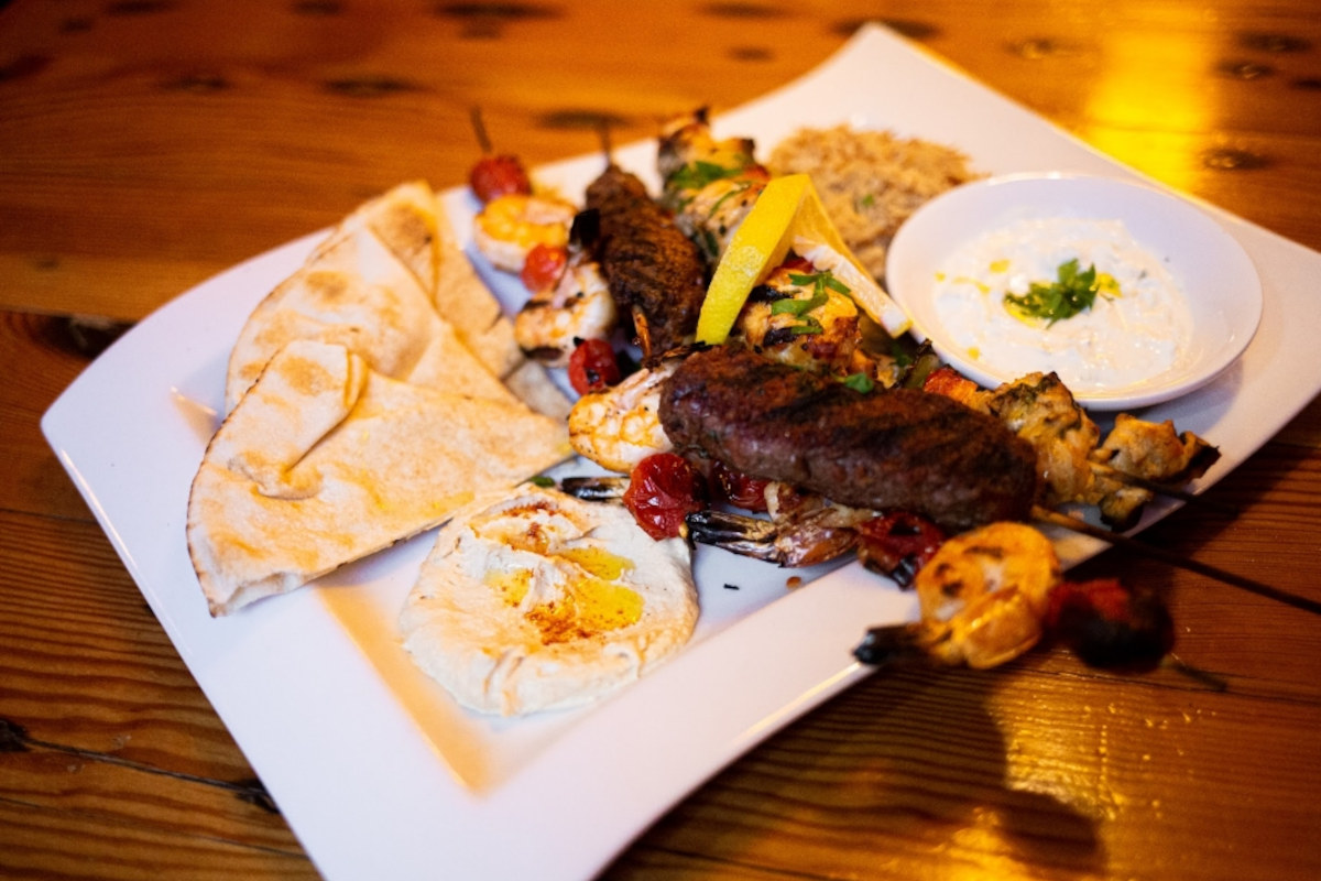 2 Chicken, 2 Kefta, and 2 Shrimp Kabobs with hummus, pita bread, rice pilaf and tzatziki $46.00