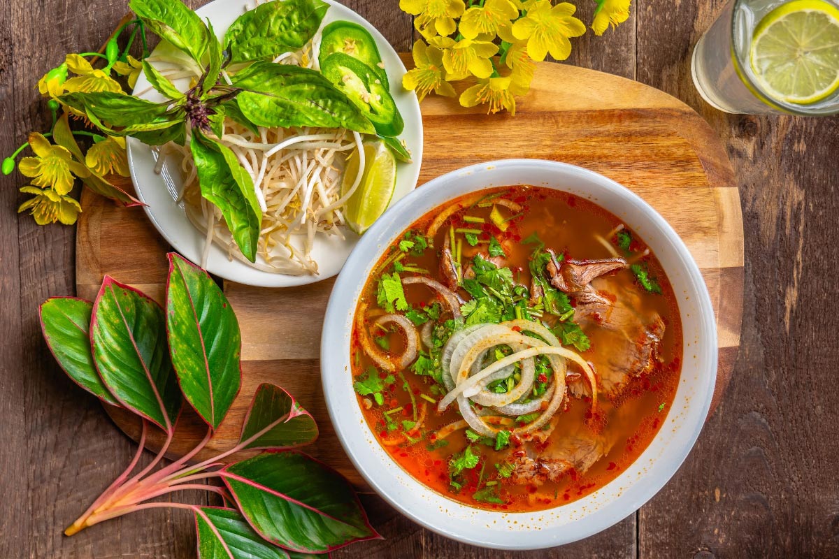 Sliced beef, basil, cilantro, peanut, carrot, white radish, cabbage, fried onion, fish sauce.