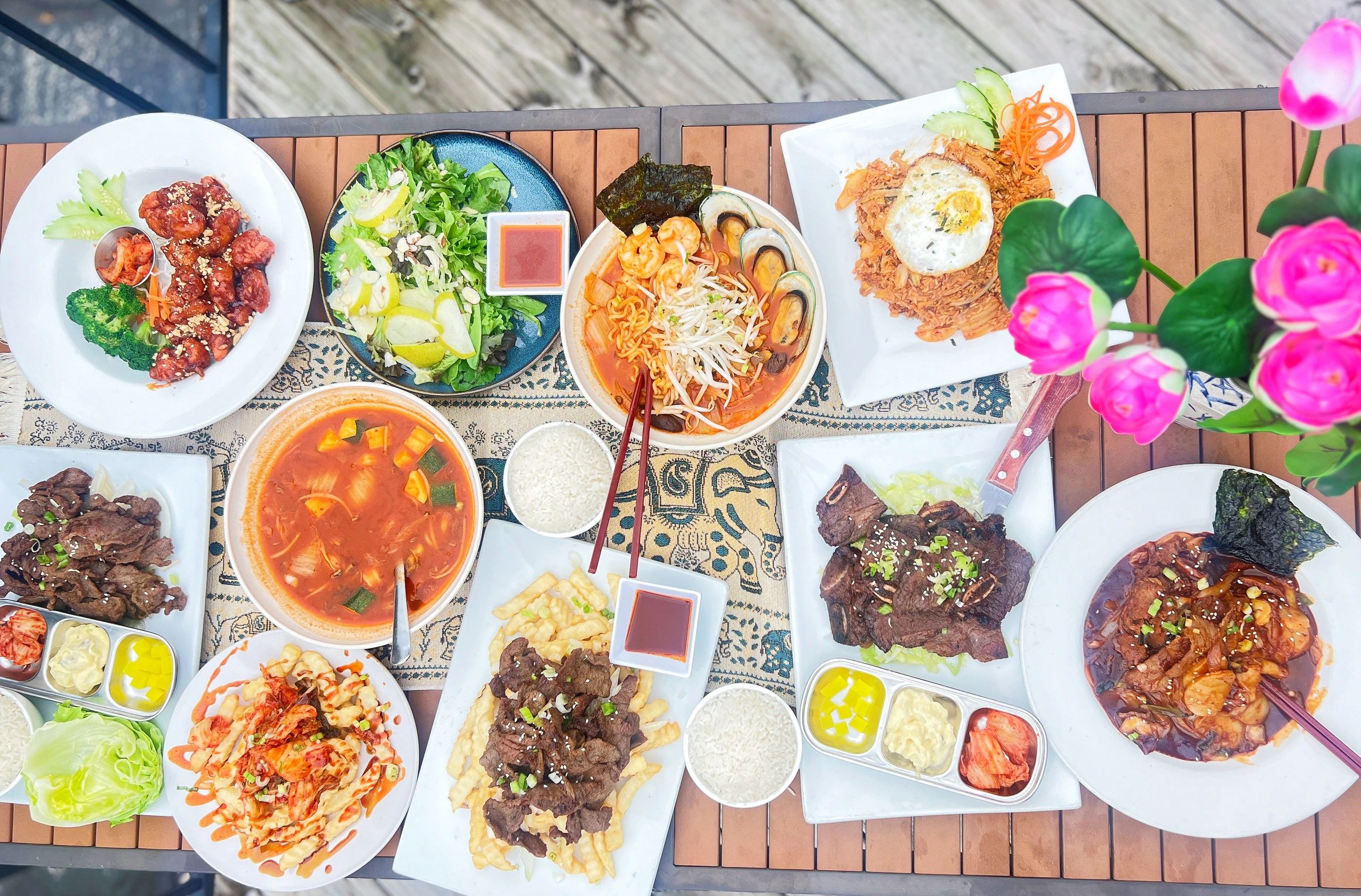 Jasmine rice | Egg | Bell pepper | Onion | Green onion | Thai Basil | Soy-based Garlic cooking sauce | Substitute Protein option for Seafood.