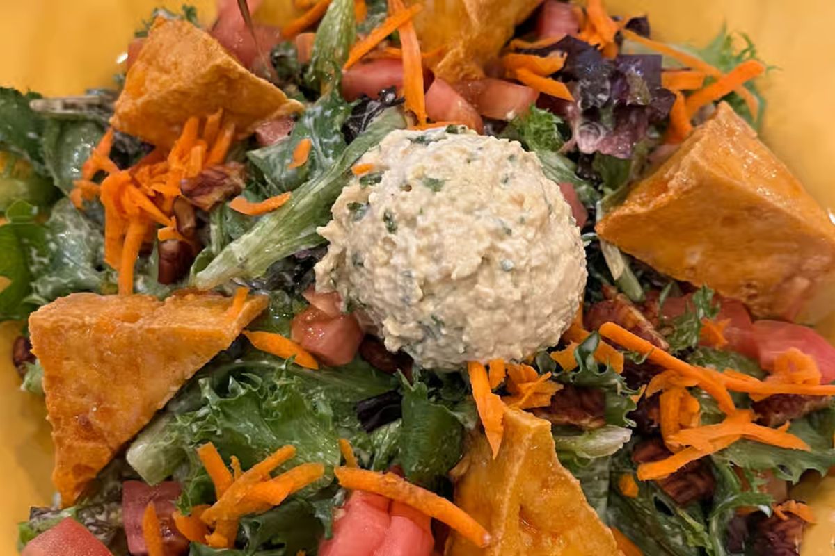 Sesame glazed vegan chicken, mixed greens, carrots, scallions, bell peppers & sesame dijon.