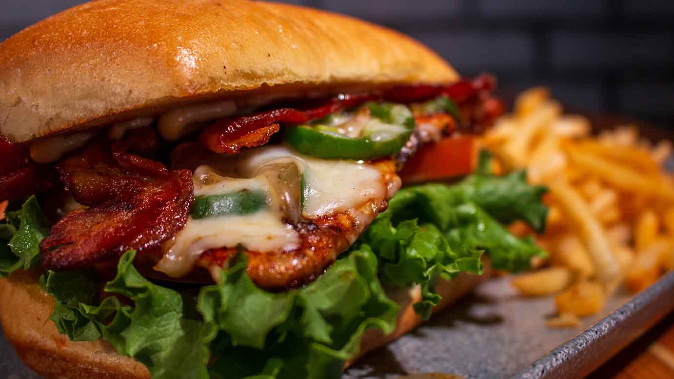Ciabatta bread, grilled chicken, mayonnaise, jack cheese, lettuce, tomato, jalapeno, bacon, caramelized onion.
