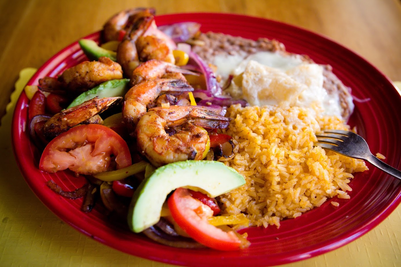 Served with rice and beans (re-fried or frijoles de la olla). Made with carne or shrimp or fish or chicken Asada or guacamole.