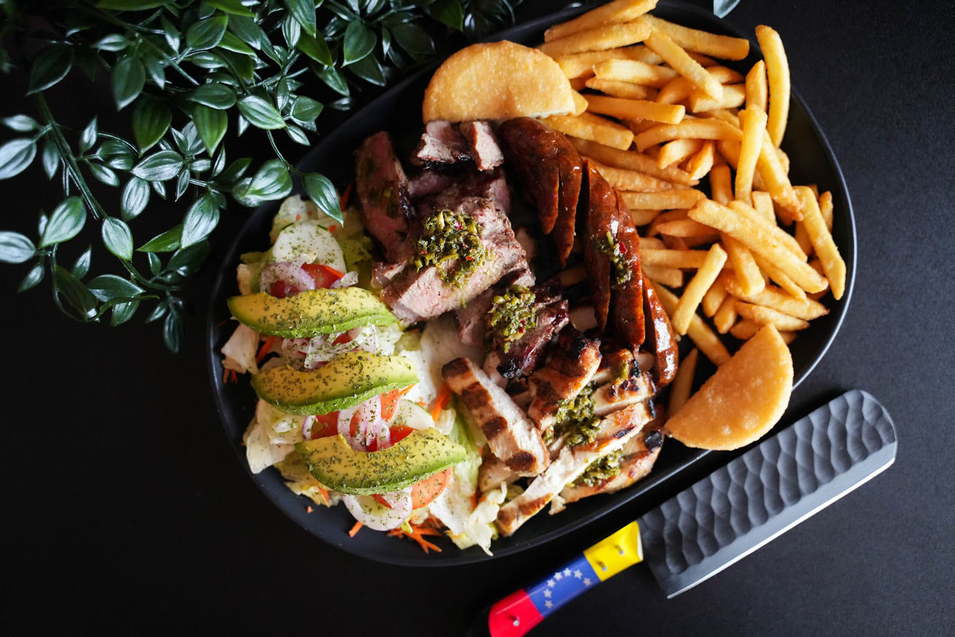 Two fried mini Arepas: *Shredded Beef & Cheese | *Shredded Chicken & Cheese β’ 2 Mini Ground Beef Empanadas | 4 Pieces of fried Yuca | 4 Pieces of Tostones | 4 Tequenos (Dough Wrapped Cheese Sticks) | 1 Container of Garlic or Pink sauce β’ There are not changes or substitutions.