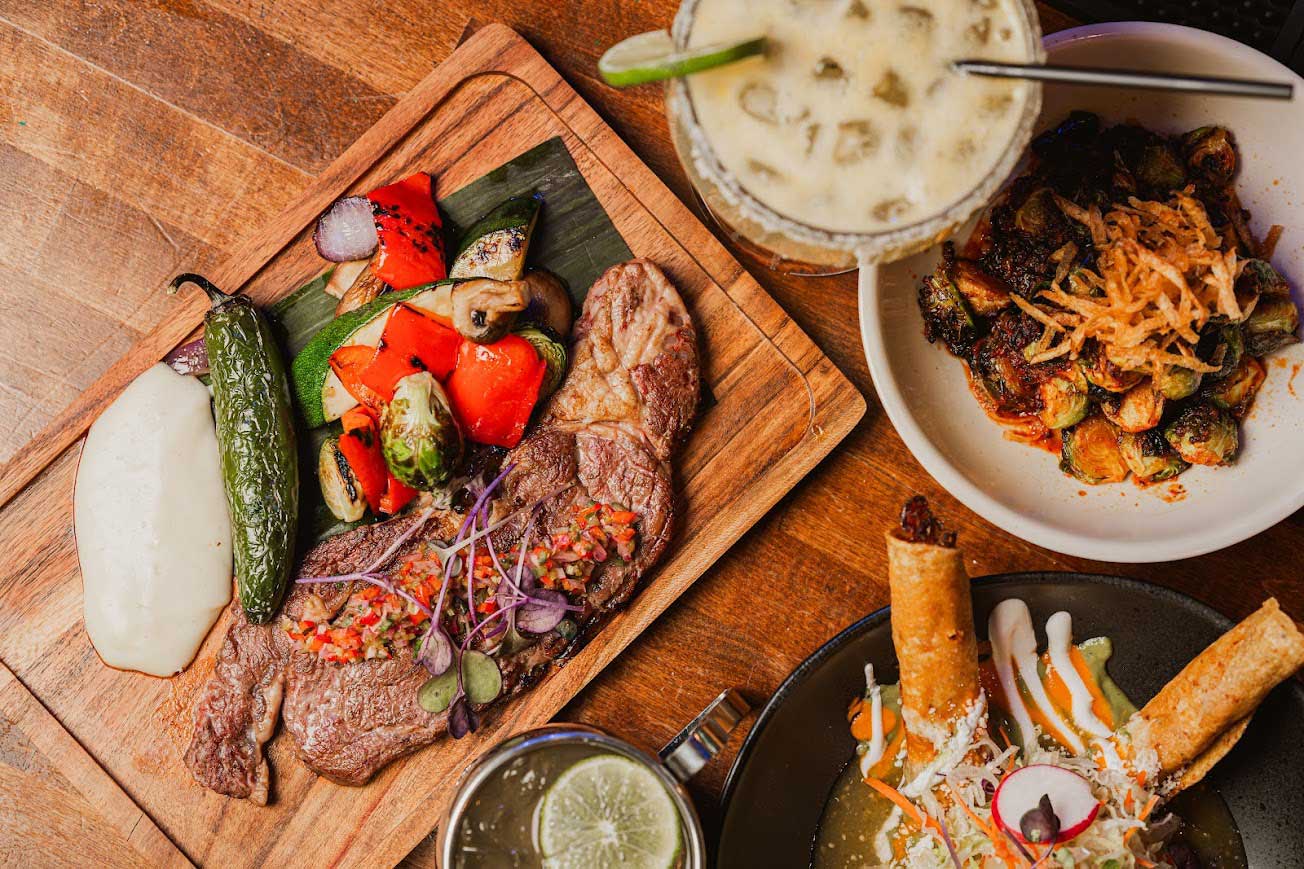 Ribeye steak cooked to perfection, paired with grilled veggies, chimichurri, and mash potatoes