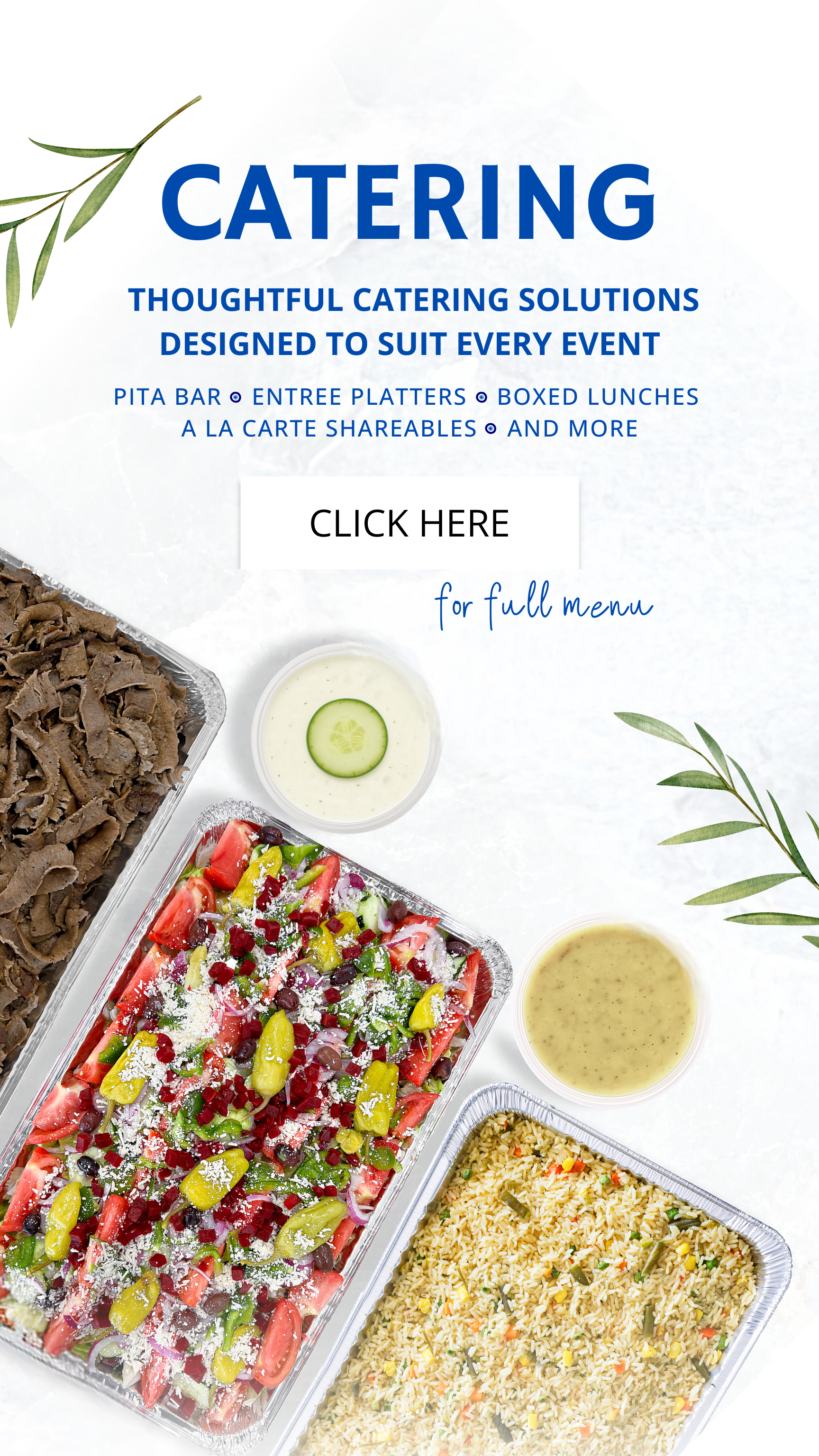 Chicken, Gyro, or Falafel, with Hummus, Olives, Lettuce, Tomato, Onions, Feta Cheese and Tzatziki Sauce.