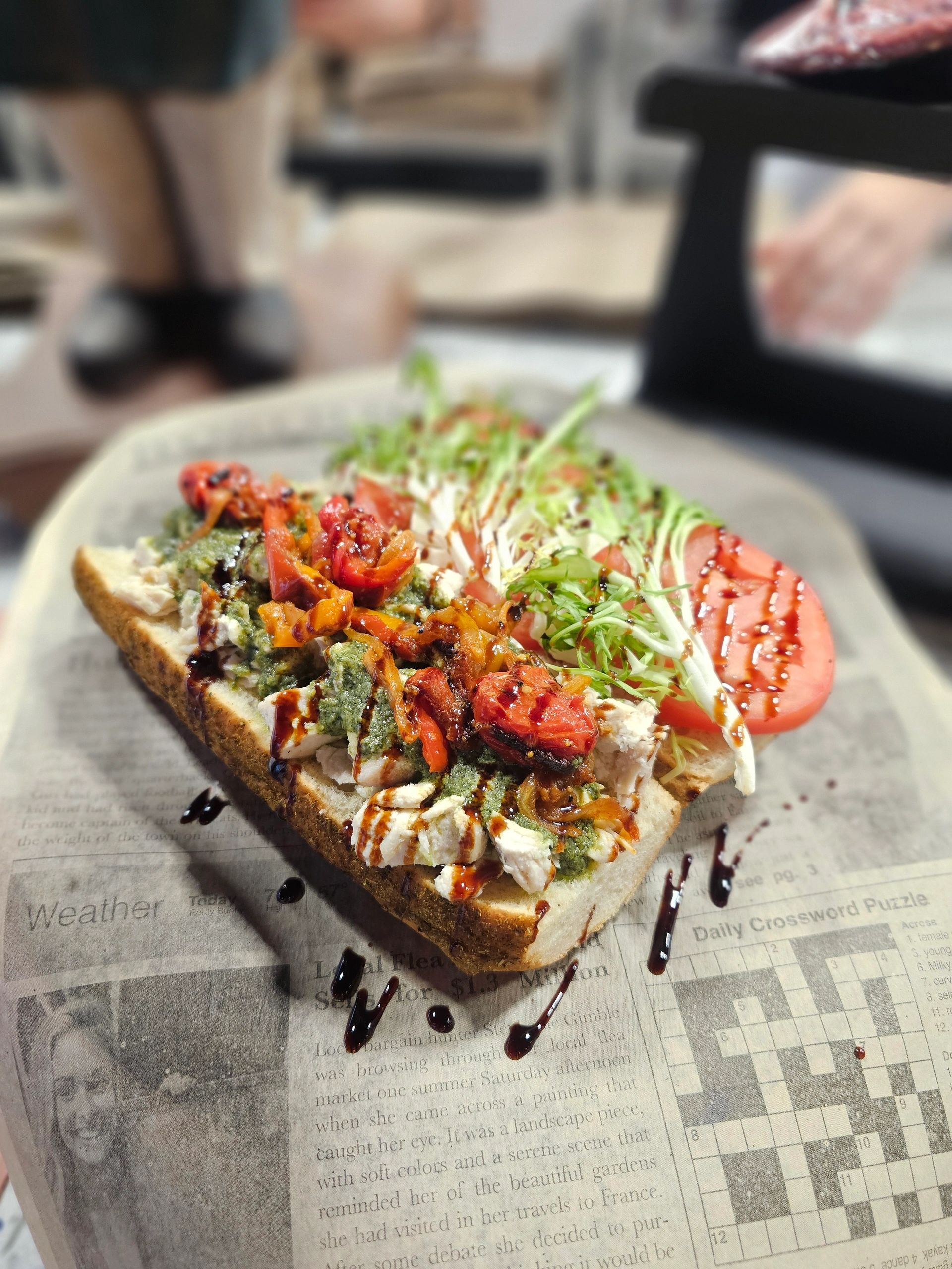 Sliced vine-ripened tomato, creamy avocado, cage-free eggs, pesto, toasted sourdough bread