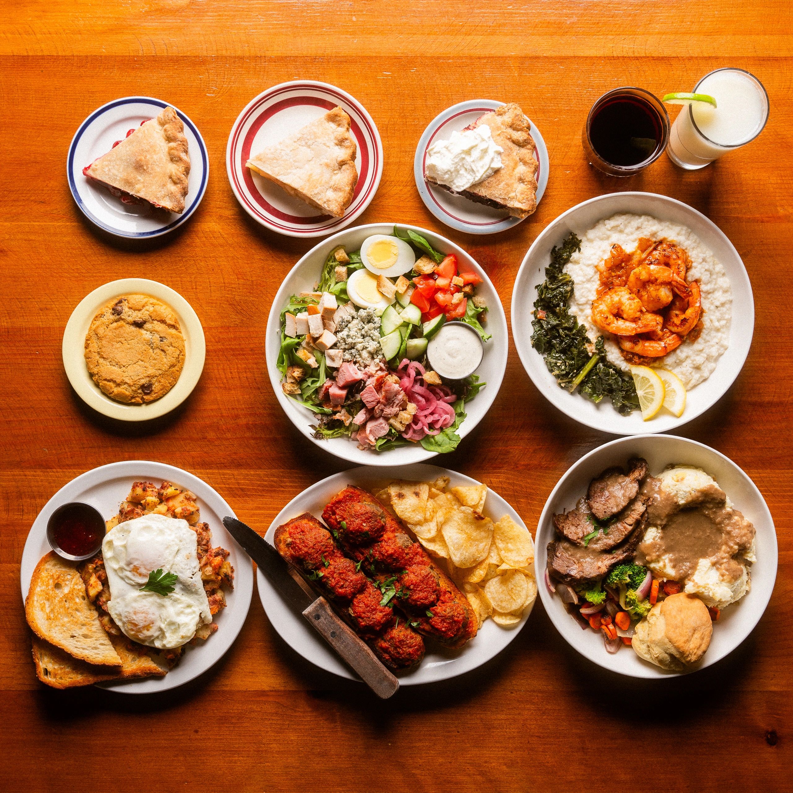2 eggs any style, cheesy grits, garlicky greens, house made biscuit. Choice of bacon, pork sausage links. Add $2 for house made chicken sausage patties