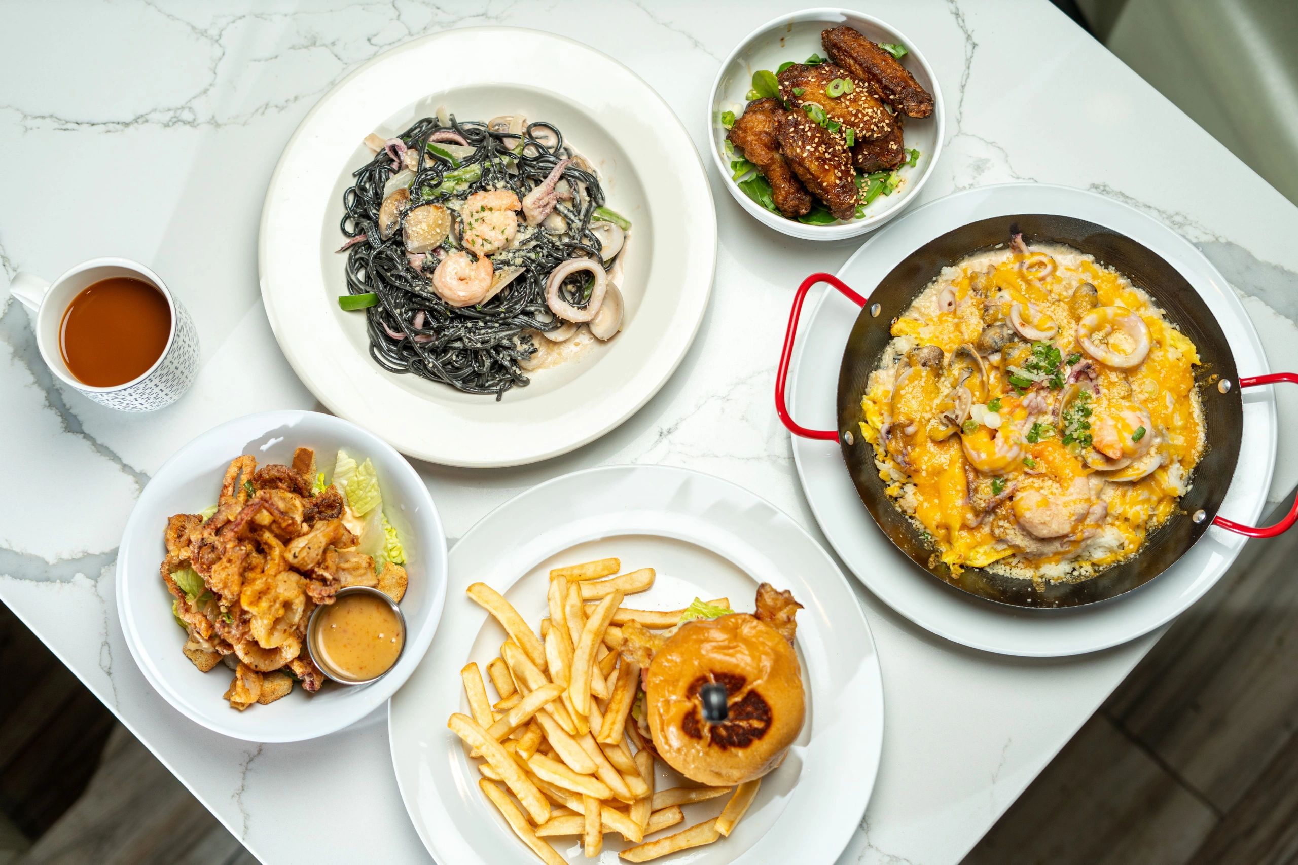Shrimps, clams, and squids in rich creamy cheese sauce over golden fried rice.